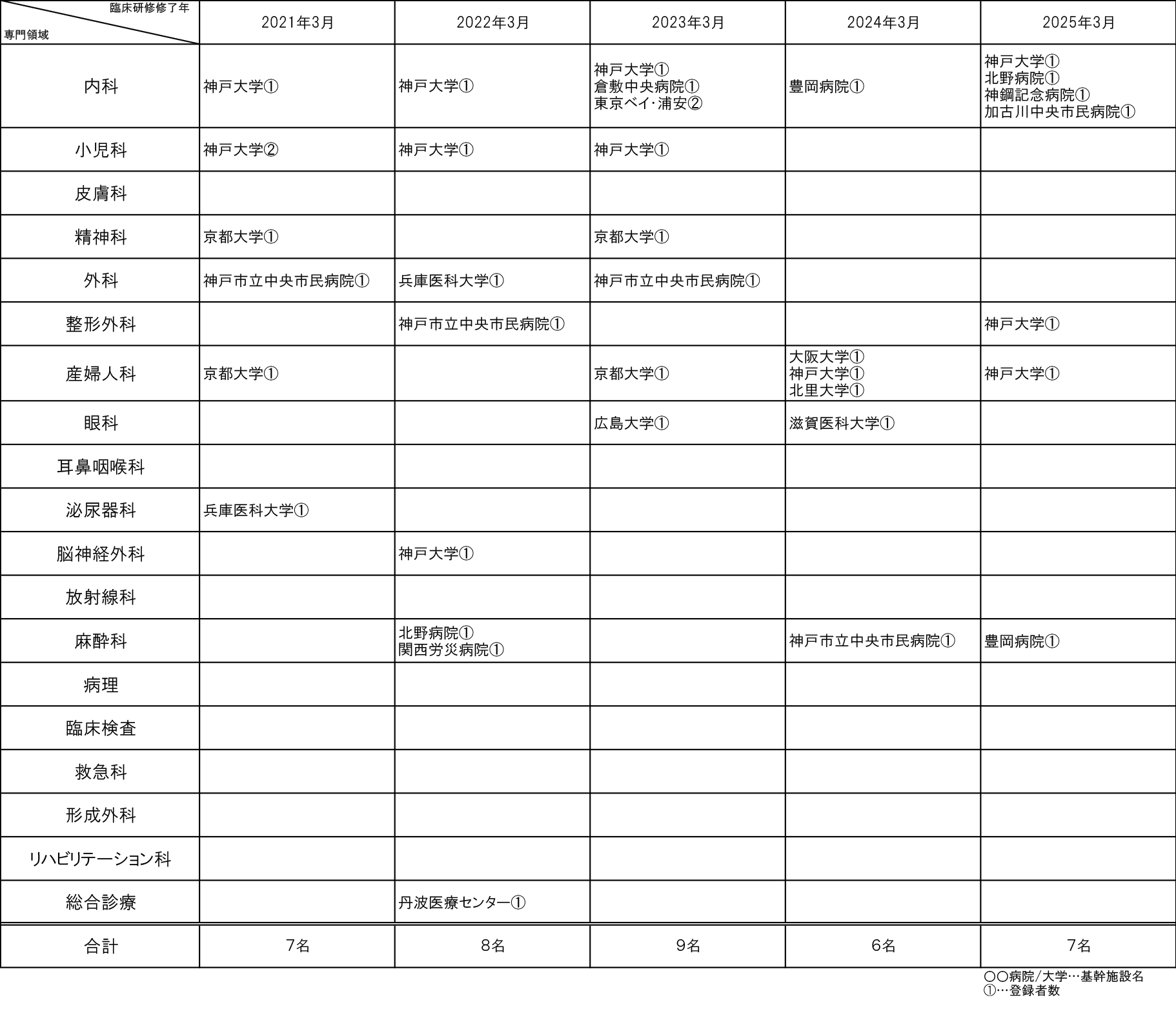 内科、小児科、皮膚科、精神科、外科、整形外科、産婦人科、眼科、泌尿器科、脳神経外科、放射線科、麻酔科、病理、救急科、形成外科、総合診療科