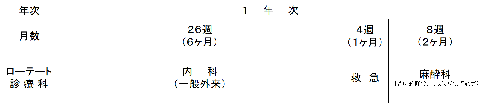 - 救急(必修12週)は、1年次の救急外来(4週)、麻酔科(4週)と、2年間を通じて行う宿日直(月4回程度)のうち、1年次の救急研修と2年次の選択研修期間の宿日直を救急の並行研修とすることにより、合計12週の研修とする。